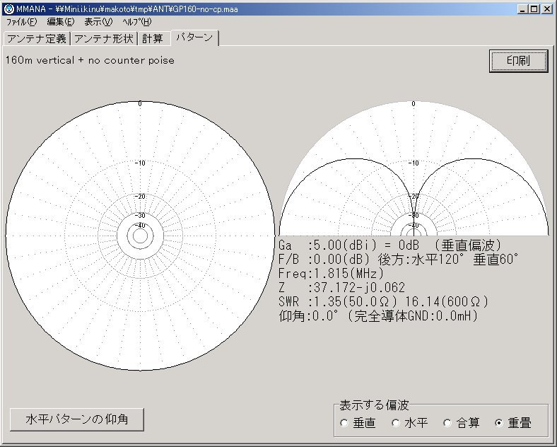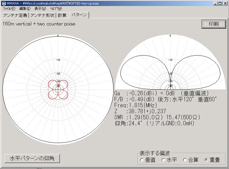 垂直一本、カウンタポイズ二本、実接地 (real ground), ground screen 無