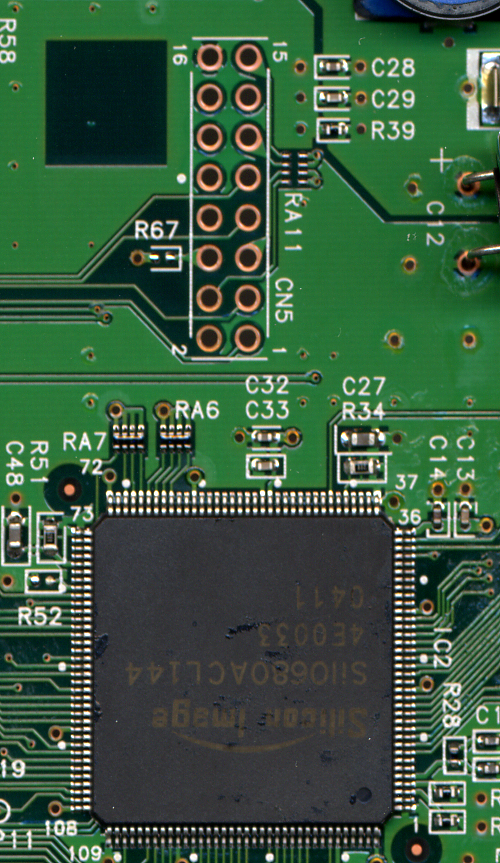 表側の Silicon image の 上側に JTAG 用の 16 pin CN5 の穴 が空いている。