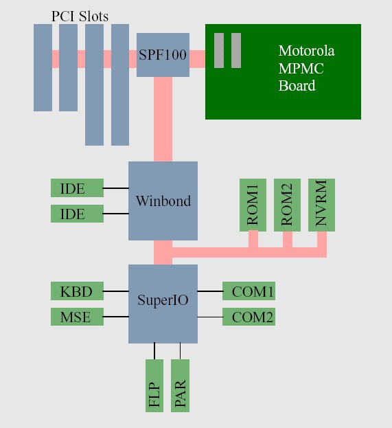 四つの PCI slot , 二つの IDE、Keyboard, Mouse, Floppy, Parallel, Communication Serial Line が接続可能です。また図で SPF100 と書いてあるのは FPGA で IRQ や BUS の接続を制御します。